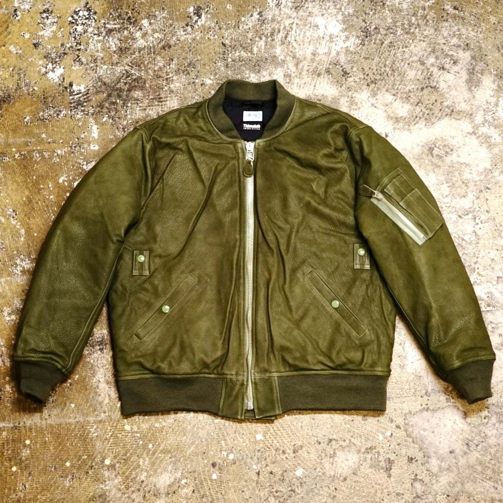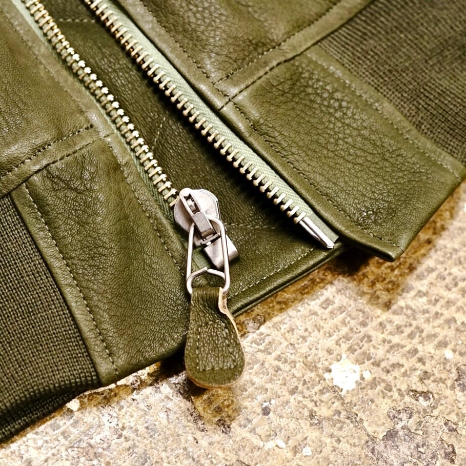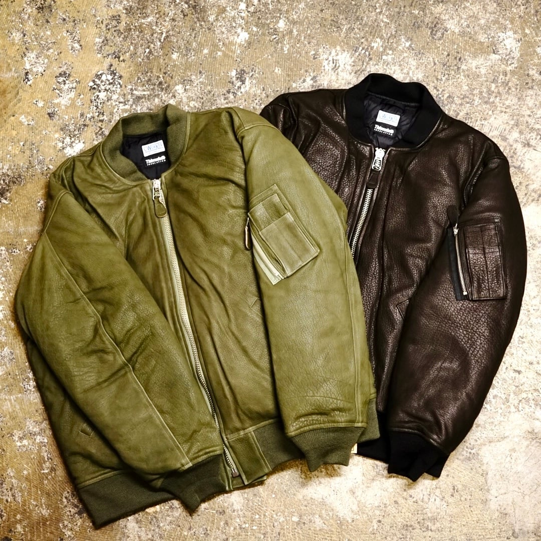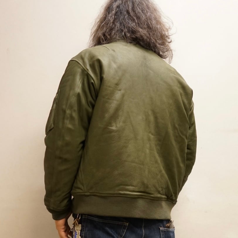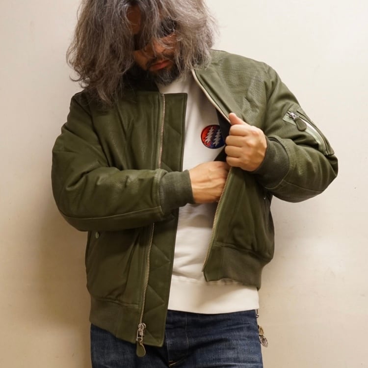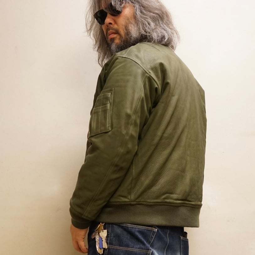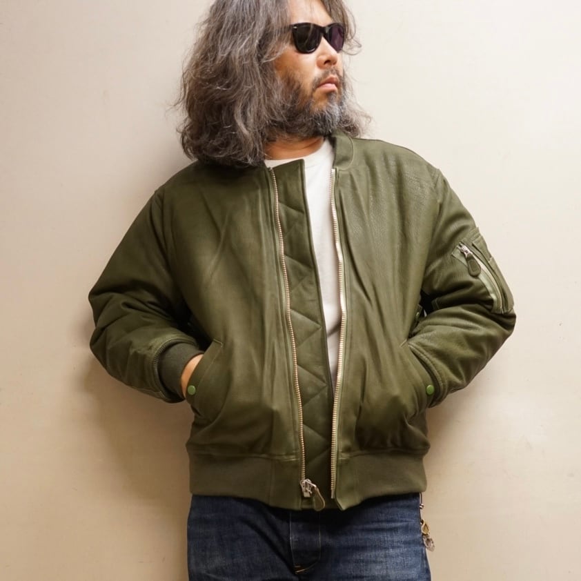 今季クリエイティブワークスが提案する、ナイロンフライトジャケットの代名詞とも言える、初期型タイプのMA-1をモチーフにした、ディアスキンレザーで製作をした【Lea】。