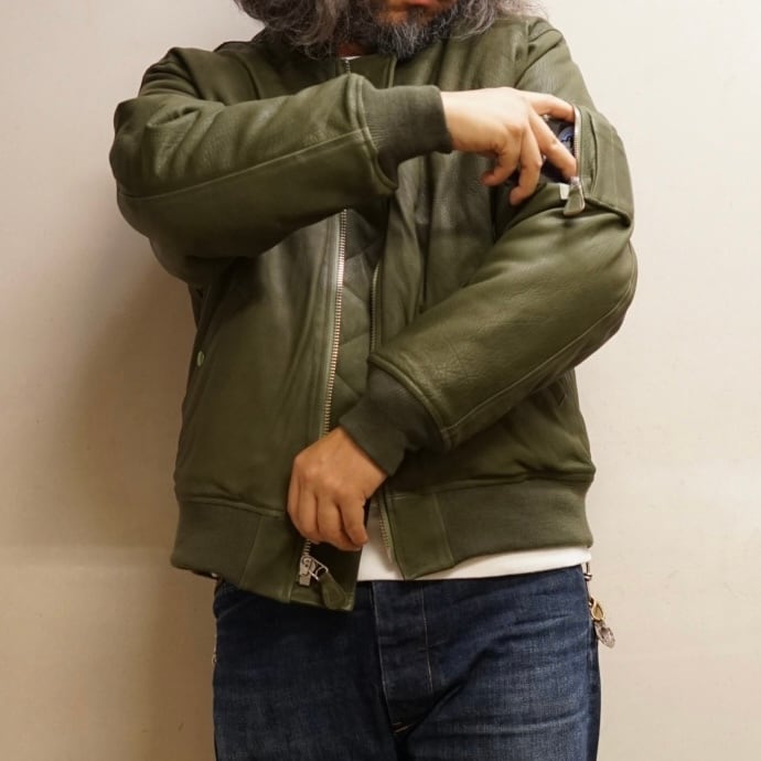 また、本来のMA-1は、袖付けのパターンと肩周りの中綿により、着用時に丸味を帯びたシルエットになりがちですが、この【Lea】はその辺りを見事に改良しており、美しい絶妙なシルエットに仕立てられおります。