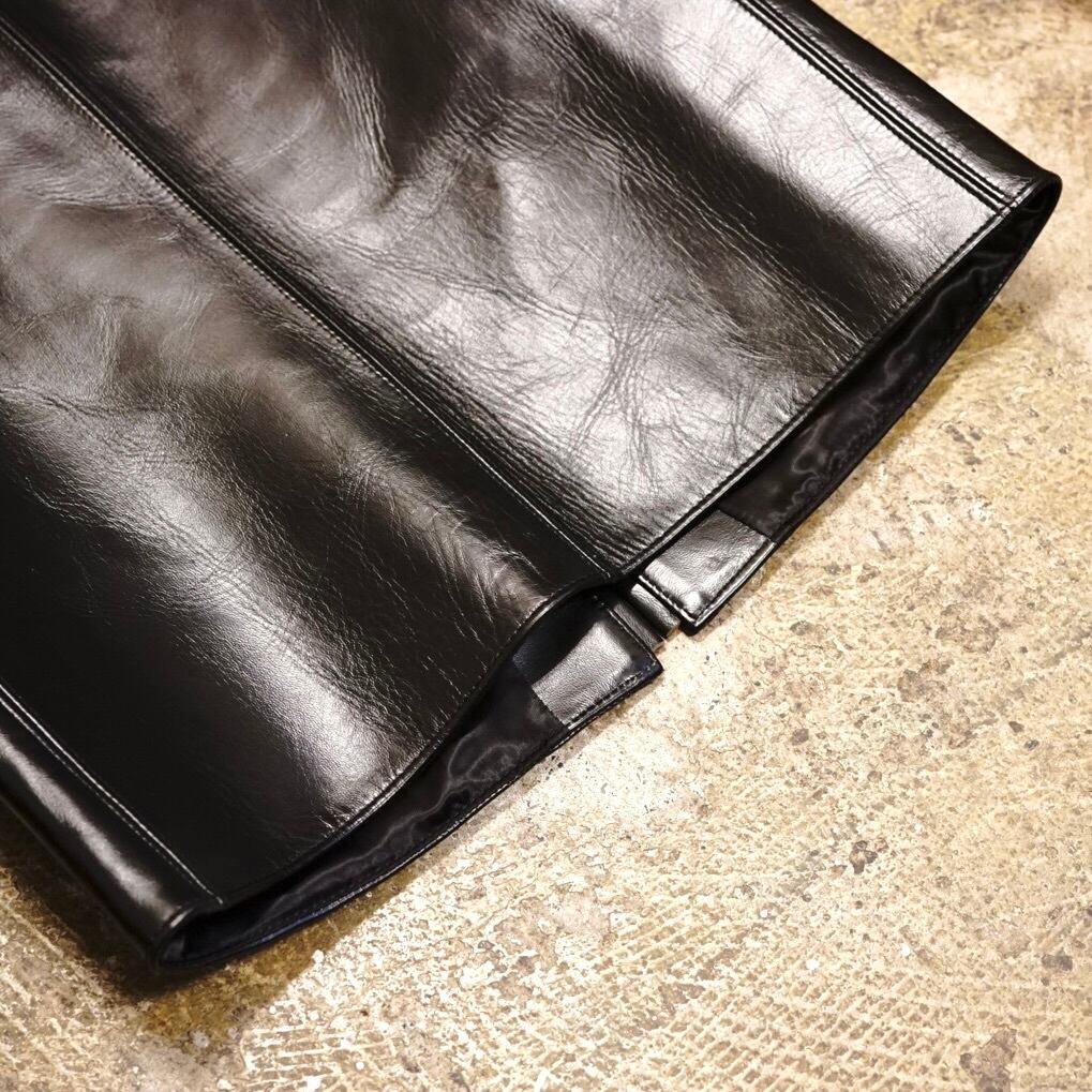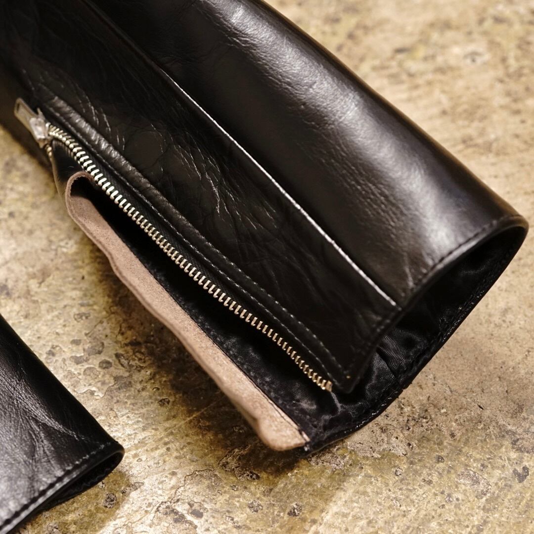 光沢感がある皮革は、ポーランド産の馬革を植物性タンニンで鞣した後、顔料にて仕上げがされた茶芯の馬革となります。着込むと細かいシボ感が現れ、しっかりと着ジワが付く上質な馬革となります。また、茶芯となりますので経年変化により茶色が出てくるタイプの皮革です。